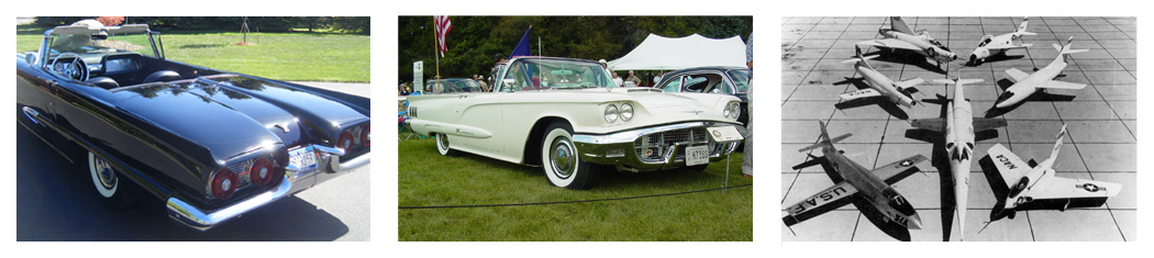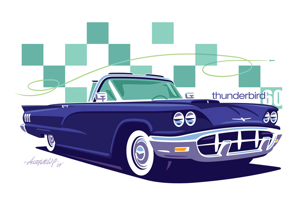 The car designs of the late 50’s were beautiful to the artistic eye. With their long sleek profiles and wonderful tailfins. My digital graphic illustration (above) was created by using a limited color palette and simplifying shapes. Then a body color change to sharpen the curves. The “T-Bird” (see photo below middle) was found and shot at the Meadowbrook Concours d’Elegance Car Show in Rochester Hills. (Photoshop/Illustrator)