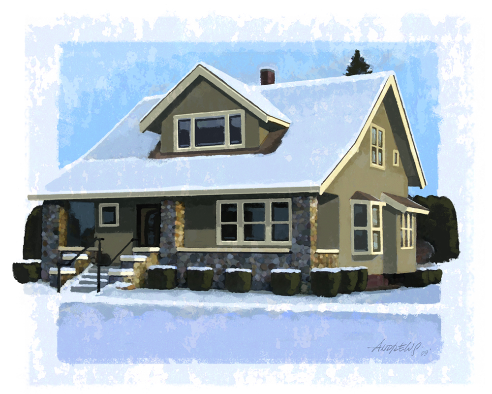 This wonderful bungalow caught my eye as I was shooting reference one snowy day in Rochester (see photo below). I painted with a chalk brush and added warm and cool values to give this digital painting life. (Photoshop)