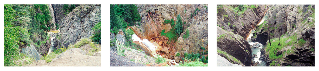 I took photos of this beautiful roadside waterfall in Ouray on a summer trip to Colorado (see images below bottom). I started this painting with a charcoal pencil brush (see detail image below). The digital painting (above) is the end result. (Photoshop)