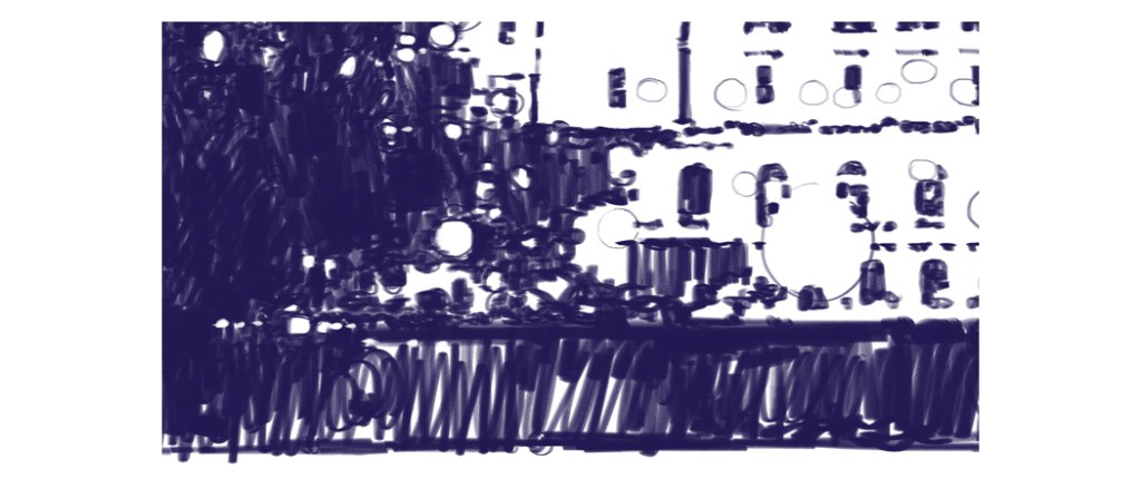 This rough sketch illustration was inspired by some paintings I stumbled upon at the Iron Horse Hotel & Bar and the illuminated capital on a resent trip to Milwaukee and Madison WI. I used a soft digital pencil for the overall dark shapes (see image below) and kept my palette limited to 8 colors. (Photoshop)