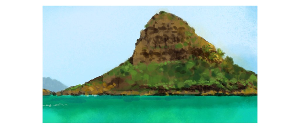 Having some illustrative fun with new watercolor brushes in Photoshop (detail image below). The reference came from a colleague at work. He took the photo while on vacation in Hawaii. (Photoshop)